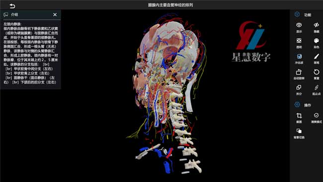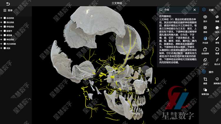 在口腔医学教育领域,颌面颈部神经系统的学习一直是教学难点。复杂的神经走行、微妙的毗邻关系以及动态的功能机制,仅靠传统二维图谱和静态标本难以**掌握。如今,星慧数字基于口腔解剖生理学虚拟仿真技术的教学系统,通过颌面颈部系统解剖中的神经模块,为医学生和学院老师提供了**的学习和教学体验。.........