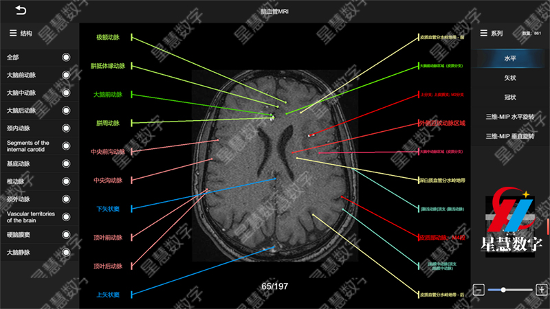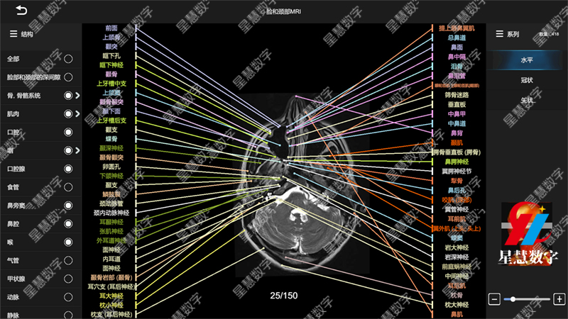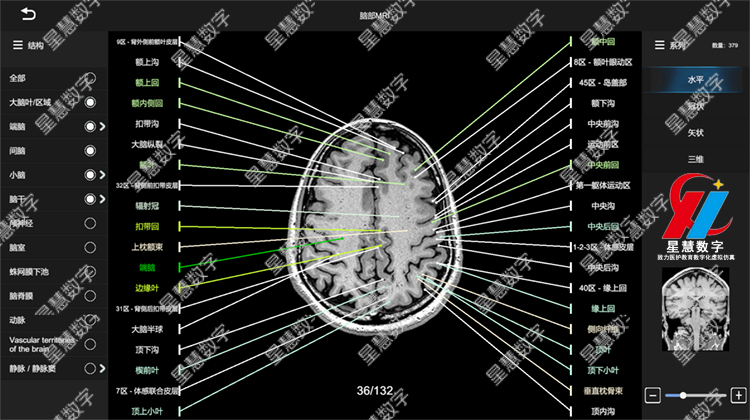 在传统口腔医学教育中,脑部MRI影像的学习常被学生称为“**烧脑的挑战”——二维切片难以构建三维空间关系,静态图谱无法完全看到神经血管的走向。而星慧数字口腔解剖生理学虚拟仿真教学系统的脑部MRI功能模块,让抽象复杂的脑部结构从多角度、多维度学习,使脑部MRI学习变得触手可及。.........