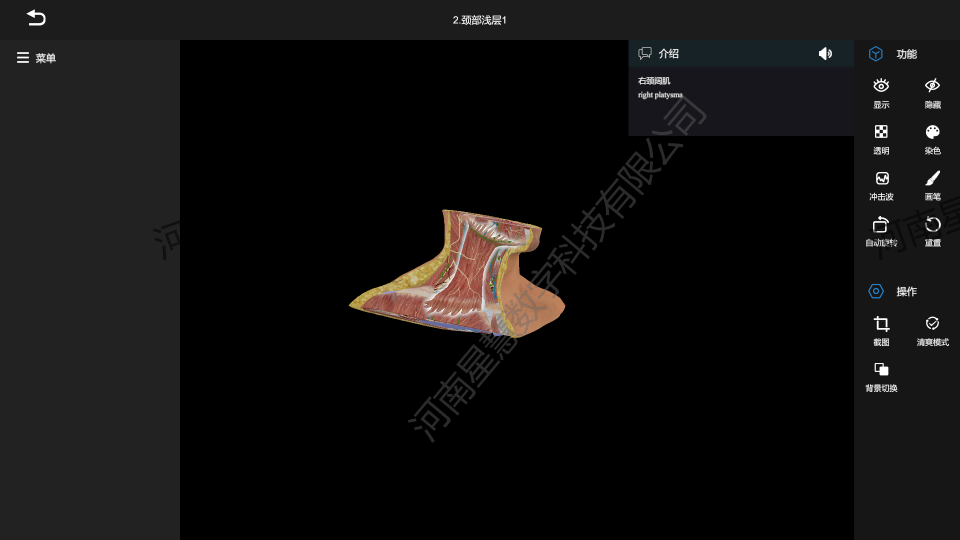 该系统依据医学解剖学教材研制开发的一款3D交互解剖软件,由系统解剖学、局部解剖学、断层解剖学、数字影像、运动原理、微课等六个模块组成。解决了传统解剖教学中“解剖标本获取难、观察方式不系统”等问题......产品描述:
